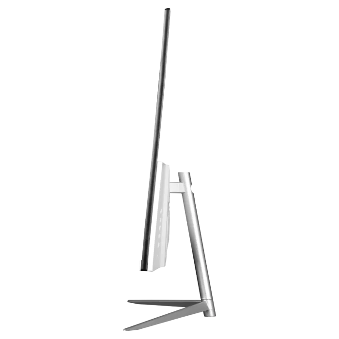 مانیتور با طراحی ساده اما مدرن عرضه شده است. حاشیههای باریک (7 میلیمتر در سه ضلع بالا و کنارهها) جلوه مینیمال و جذابی به آن میدهد. پایه با قابلیت چرخش محور عمودی طراحی شده و امکان تنظیم زاویه نمایشگر را فراهم میکند. همچنین پشتیبانی از نصب دیواری (VESA 75×75) انعطاف بالایی به کاربران میدهد.