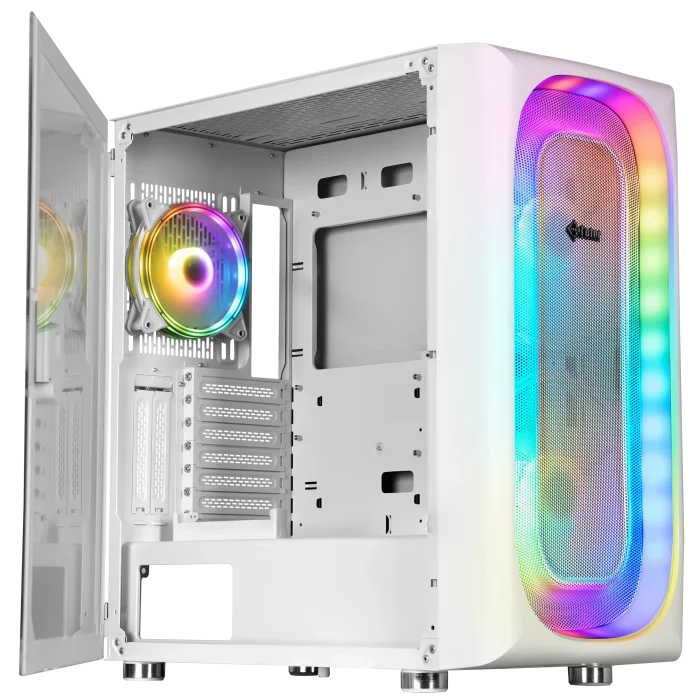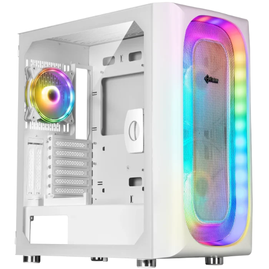 پنل جلویی از پلیکربنات و ترموپلاست با توری فلزی طراحی شده تا جریان هوا به خوبی برقرار باشد و نورپردازی ARGB آن جلوهای خیرهکننده به کیس ببخشد. کاربران میتوانند نورپردازی فنها را خاموش یا با نرمافزارهای مادربرد مانند Aura Sync و Mystic Light هماهنگ کنند. طراحی دربها بدون نیاز به ابزار باز میشوند، که نصب و بررسی قطعات داخلی را بسیار ساده کرده است.