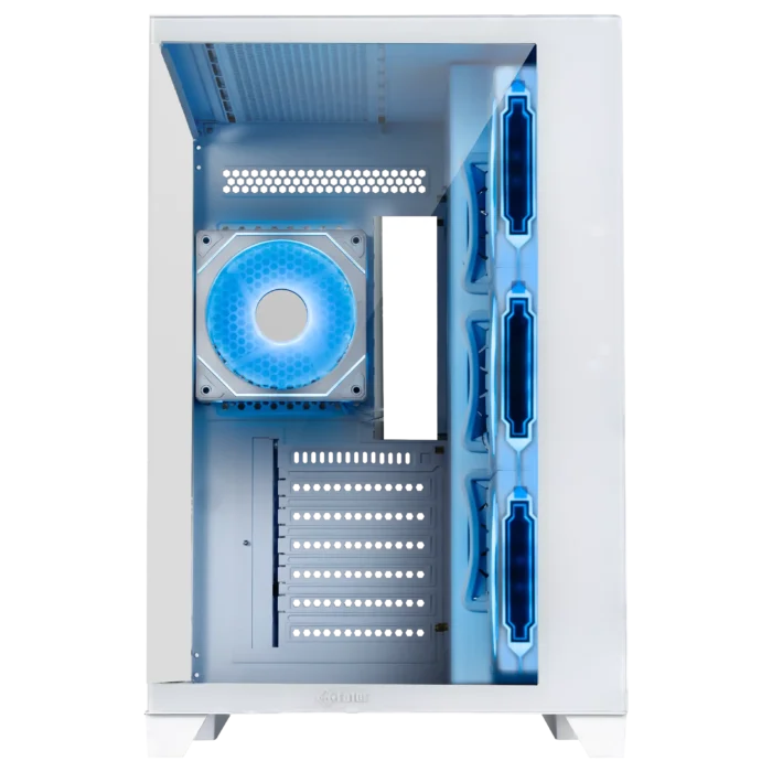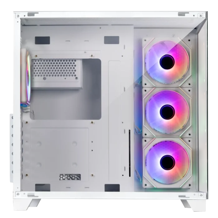 یکی از نقاط قوت Fater FG-880W، سیستم خنککننده آن است. این کیس از ۱۰ فن ۱۲۰ میلیمتری پشتیبانی میکند و ۴ فن ARGB از پیش نصب شده دارد. طراحی پرهها به شکل باله کوسه، جریان هوا را بهینه و نویز سیستم را کاهش میدهد. پشتیبانی از خنککنندههای بادی تا ارتفاع ۱۶۵ میلیمتر و خنککنندههای مایع تا رادیاتور ۳۶۰ میلیمتری، امکان نصب سیستمهای خنککننده قدرتمند را فراهم میکند.