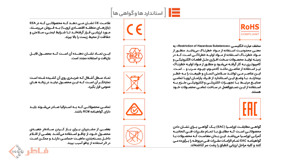 - استانداردها: دارای تأییدیههای بینالمللی نظیر CE، RoHS، RCM و EAC