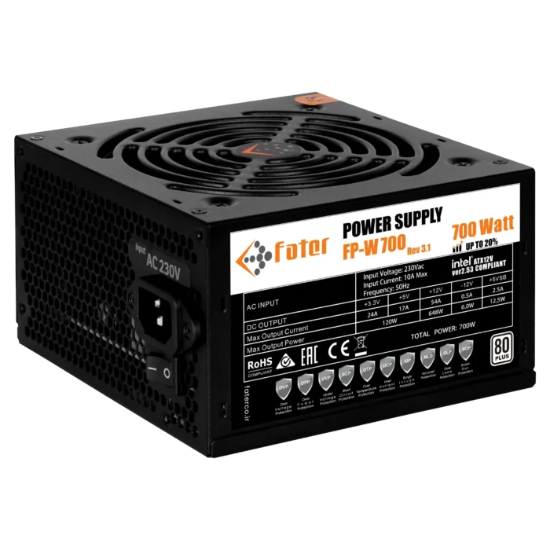 پاور فاطر مدل FP-W700 یک منبع تغذیه ATX و ۶۰۰ وات با قیمت مناسب و طراحی کابل غیر ماژولار است. اگرچه این منبع تغذیه از قابلیت کابلهای ماژولار برخوردار نیست، اما با داشتن بدنه فولادی مشکی و فن خنککننده 120 میلیمتری، از کیفیت ساخت مناسبی برخوردار است. این منبع تغذیه دارای PFC فعال برای ارائه کارآمد انرژی و گواهینامه 80 Plus برای صرفهجویی معقول در مصرف انرژی است. این واحد تمام اتصالات ضروری برای تامین انرژی یک کامپیوتر از سطح پایه تا میانرده را ارائه میدهد، از جمله یک کانکتور CPU 8 پین و دو کانکتور PCIe 6+2 پین برای کارت های گرافیک. به طور کلی، FP-W700 یک گزینه عالی اقتصادی برای کاربرانی است که در حال اسمبل سیستمی هستند که نیاز به پاور با توان نسبتا بالا دارند.