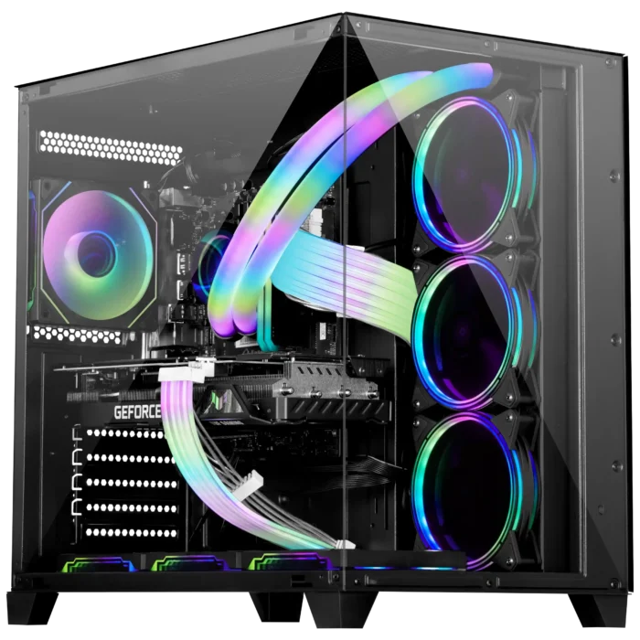 در نورپردازی داخلی از فنهای RGB با قابلیت کنترل رنگ استفاده شده که جلوهای حرفهای و قابلشخصیسازی به سیستم میدهد. همچنین چیدمان اصولی قطعات و کابلکشی تمیز، به تهویه بهتر و جریان هوای مطلوب درون کیس کمک میکند.