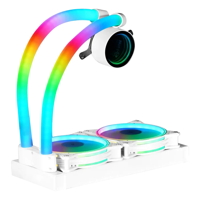 واتر کولینگ FW-240R2W1 دارای 2 عدد فن سفید به ابعاد 25×120×120 میلیمتر است. این فنها دارای نورپردازی ARGB هستند که قابلیت هماهنگشدن با نورپردازیِ فنهای واتر کولینگ و سایر قطعات کامپیوتر را نیز دارد.