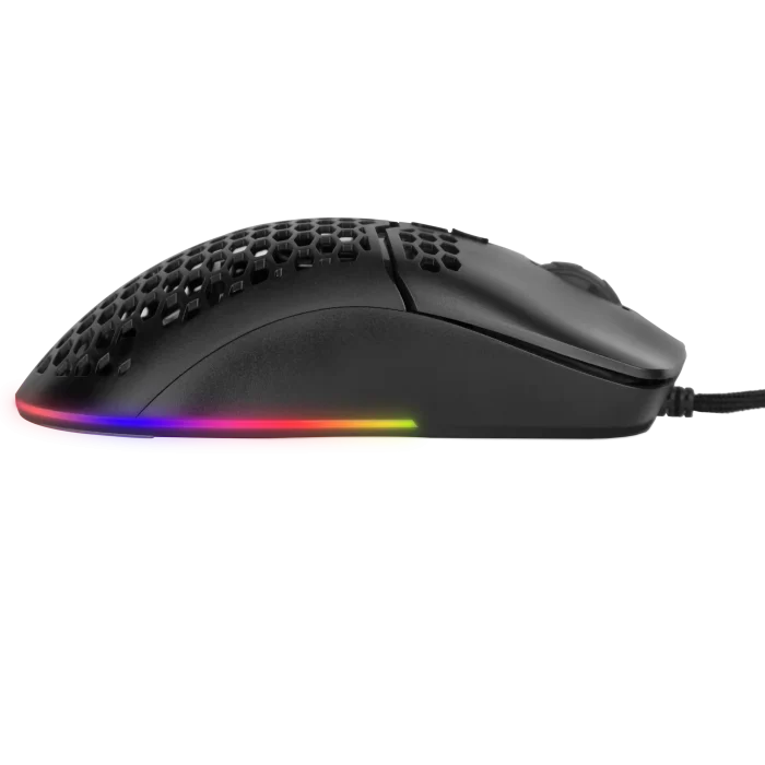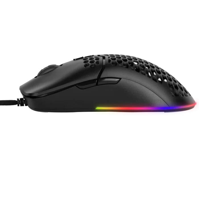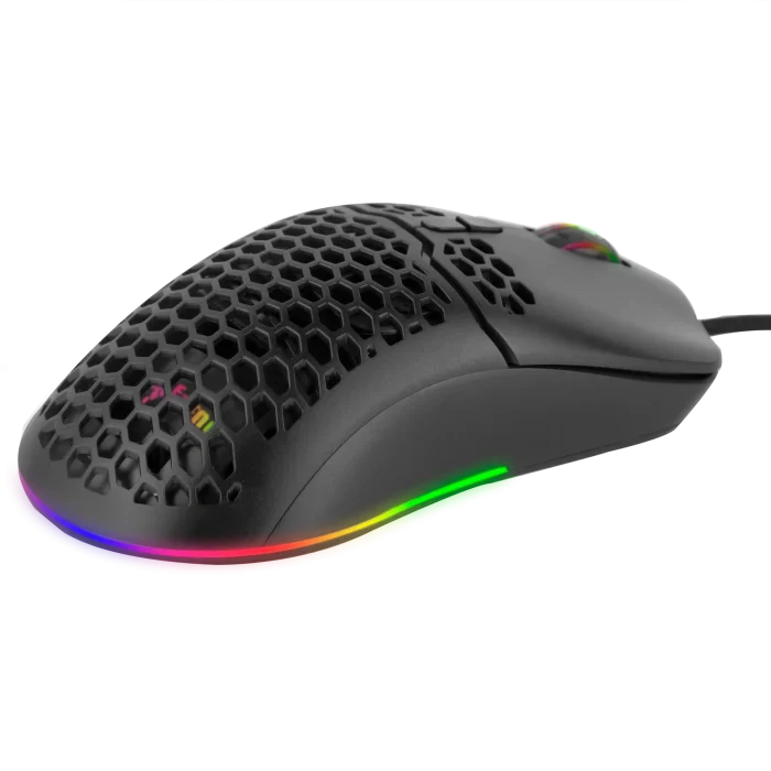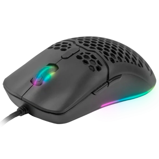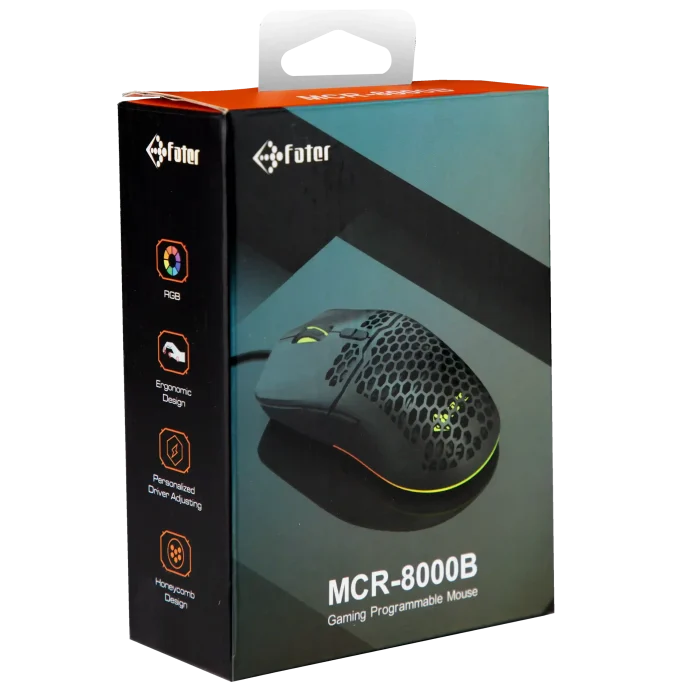 ماوس MCR-8000B دارای نورپردازی ARGB هست و ظاهر ماوس هم دارای سوراخهایی به شکل کندوی عسل است که علاوه بر زیبایی، منجر به سبک شدن ماوس هم شده است.